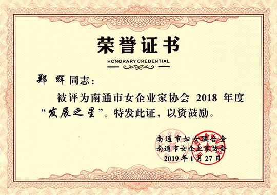 南通三圣集團(tuán)副董事長(zhǎng)鄭輝女士被南通市婦女聯(lián)合會(huì)、南通市女企業(yè)家協(xié)會(huì)評(píng)為2018年度“發(fā)展之星”,全南通市僅有8位女企業(yè)家獲此殊榮。