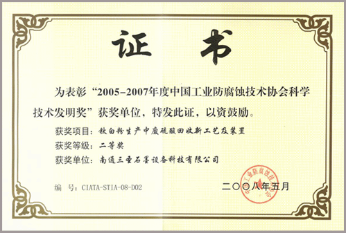 該技術(shù)通過了江蘇省科技廳科技成果鑒定,先后獲得:南通市人民政府科學(xué)技術(shù)進(jìn)步二等獎、武漢市人民政府科學(xué)技術(shù)進(jìn)步二等獎、中國工業(yè)防腐蝕技術(shù)協(xié)會科學(xué)技術(shù)發(fā)明二等獎并在多家鈦白企業(yè)中得到了應(yīng)用。