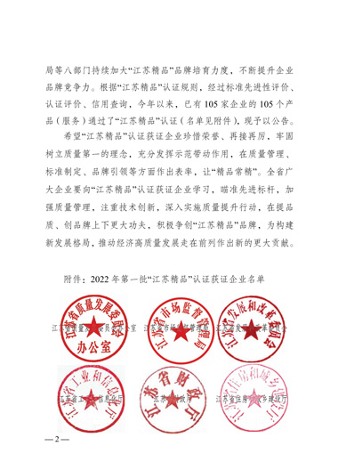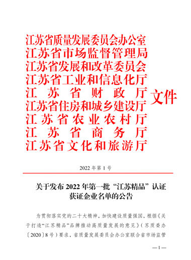 “江蘇精品”是江蘇省為推動(dòng)形成一批自主創(chuàng)新、品質(zhì)高端、服務(wù)優(yōu)質(zhì)、信譽(yù)過(guò)硬、市場(chǎng)公認(rèn)的“江蘇精品”品牌群體,以行業(yè)龍頭骨干、“專精特新”和“單項(xiàng)冠軍”等企業(yè)為主體認(rèn)證對(duì)象,參照國(guó)際慣例、運(yùn)用市場(chǎng)機(jī)制,由江蘇省市場(chǎng)監(jiān)管局會(huì)同省發(fā)改委等七部門(mén)開(kāi)展的重點(diǎn)認(rèn)證工作。