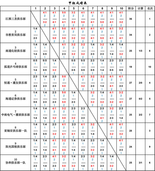 甲組:1、江淮三圣乒乓球俱樂部2、市教育局乒乓球俱樂部3、亞細(xì)亞乒乓球俱樂部一隊(duì)4、恒通·濠友乒乓球俱樂部5、海通證券乒乓球俱樂部6、協(xié)和乒乓球俱樂部一隊(duì)7、中南電氣·濠派乒乓球俱樂部8、南通化輕乒乓球俱樂部9、陽光國稅乒乓球俱樂部10、弧道乒乓球俱樂部